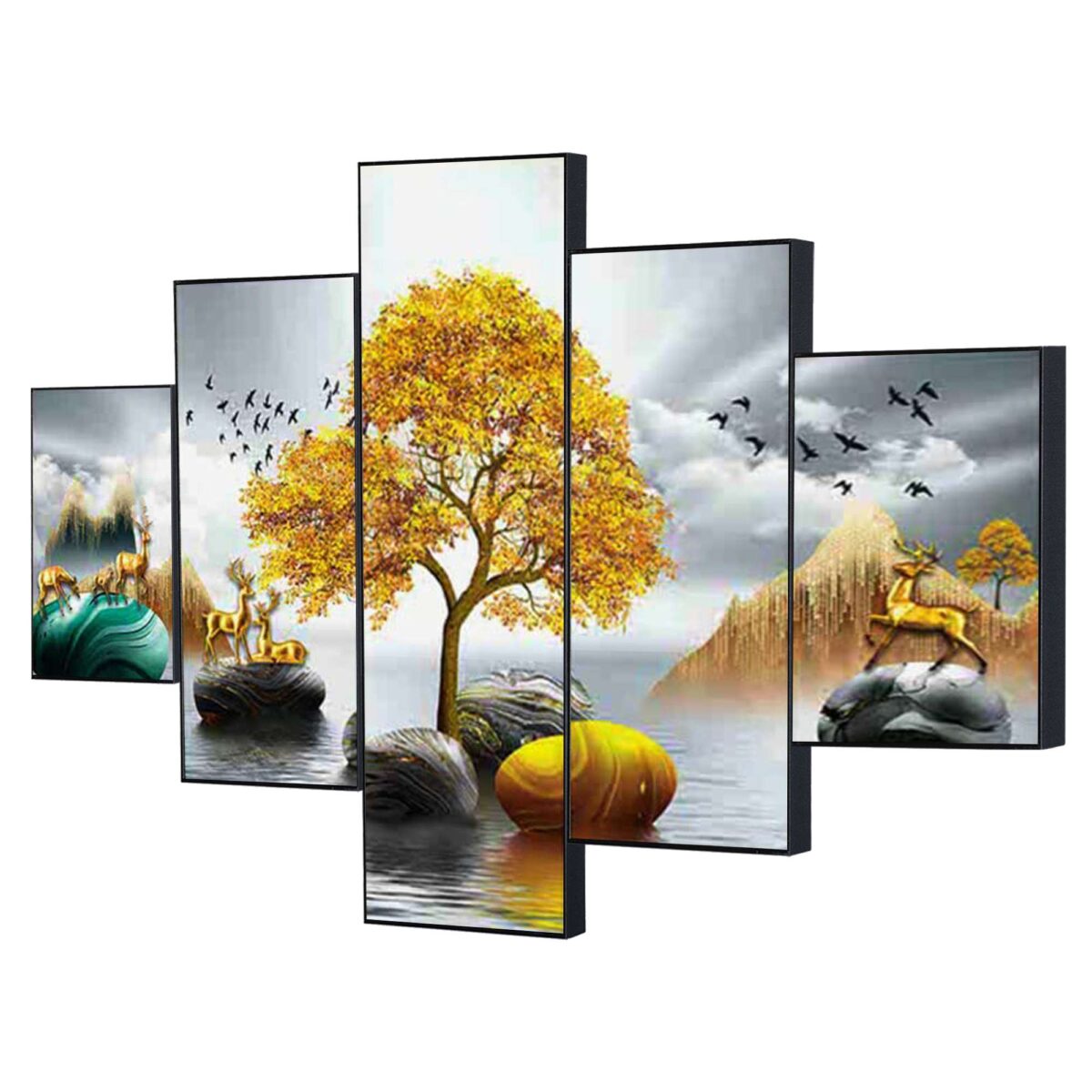Saumic Craft Presents This Set Of 5 Amazing Paintings For Your Wall . The Painting Will Completely Change The Atmosphere Of The Room Whire It is Placed . The Paintimg Is Made On Heavy Wooden Board And Has A Digital UV Coating On It Which MAKES It Very Easy To Clean . Pricing Of The Product Is Made Very Reasonable From Our Brand As Per The Quality We Are Providing To Our Customers, We Assure That You Will Not Regret Your Purchase, Saumic Craft Is Well Known for Its After Sale Services And In Case If You Feel Some Problem With Any Of Our Product Than You Can Replace It For Free With No Additional Cost . This painting offers a stylish look to your wall as this piece includes three themes it is vastu and also have the essence of abstract and modern art which makes this peice unique and stylish . The 5 pieces wall painting is made with high-quality material, the HD quality print looks fantastic and bright it will not fade easily. With just few simple steps you can mount it to the wall. Thank You For Yor Purchase